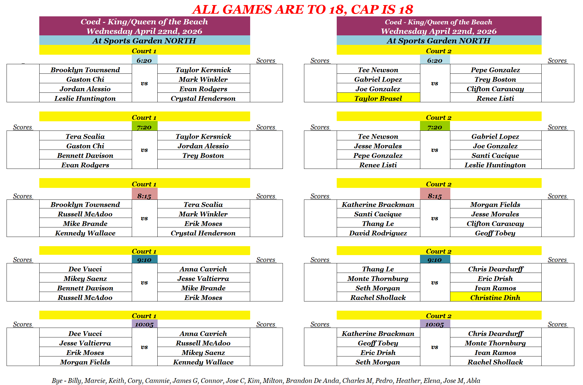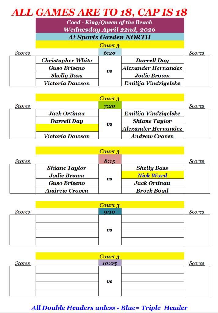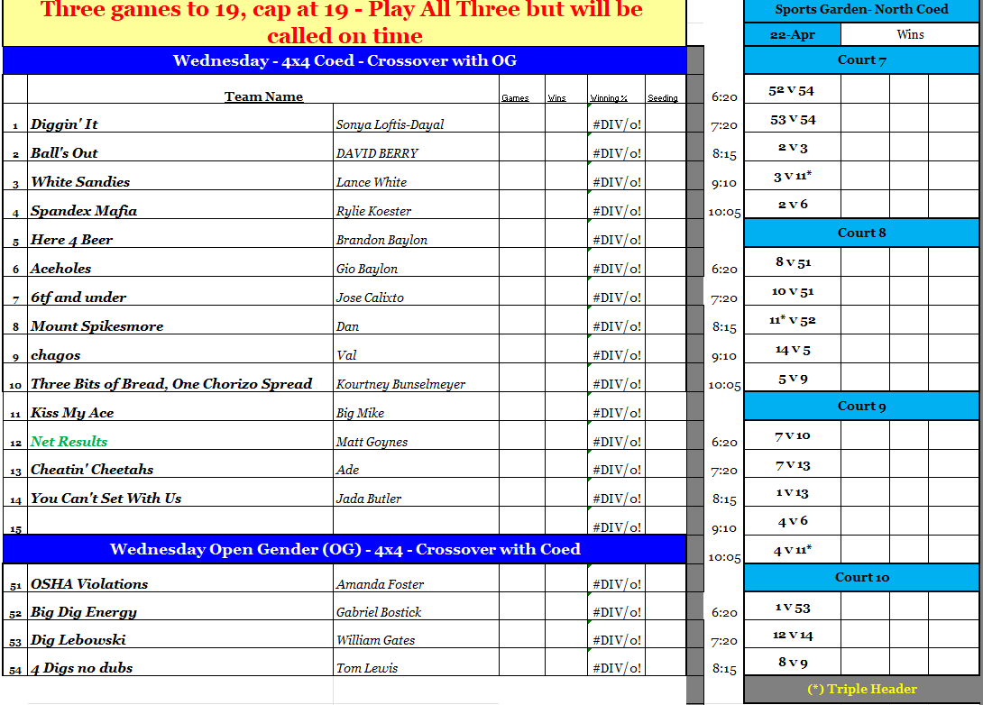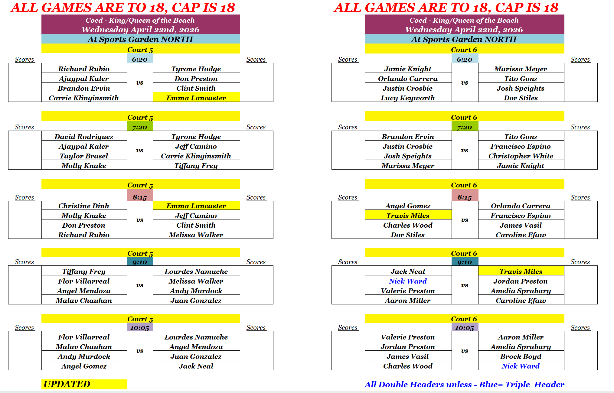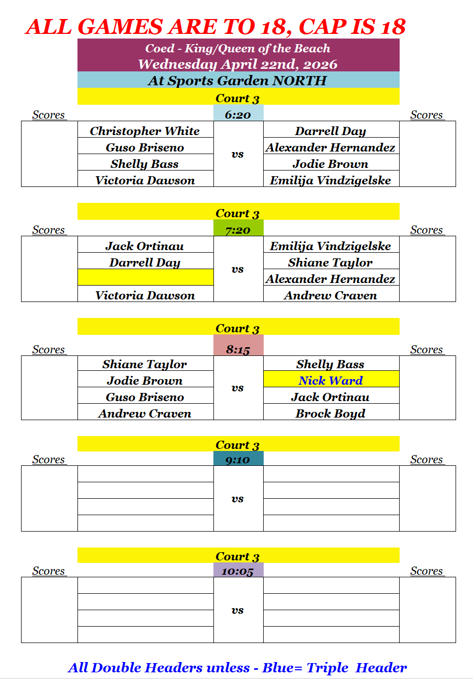 All Double headers. If name in Blue=Triple Header